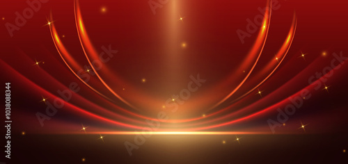 © Pramote, Fototapeta premium Abstract elegant red curved ray with gold lighting effect sparkle on dark red background. Template premium award design.