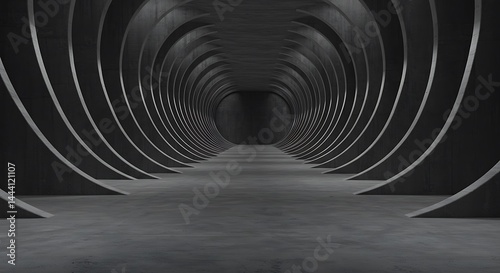 © BRNSN, Obraz premium Abstract empty, modern concrete room with indirect lighting from back with rows of bend walls on the sides and rough floor