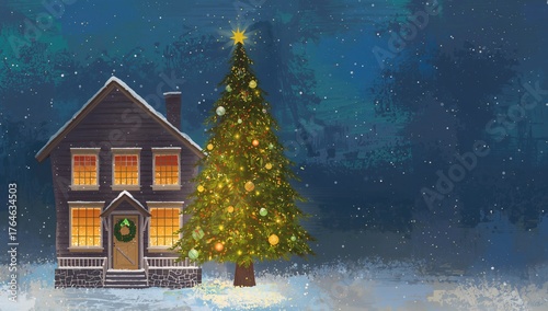 Fototapeta premium Abstract festive backdrop featuring a lighthouse and a decorated tree