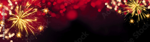 © Corri Seizinger, Naklejka premium Abstract festive Silvester Party celebration background panorama banner long - Red golden firework on red texture with bokeh lights and space for text