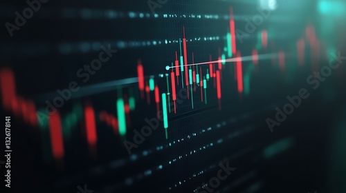 © Tackey, Obraz premium Abstract Financial Data Visualization with Colorful Graphs and Candlestick Chart Indicators in Dark Background