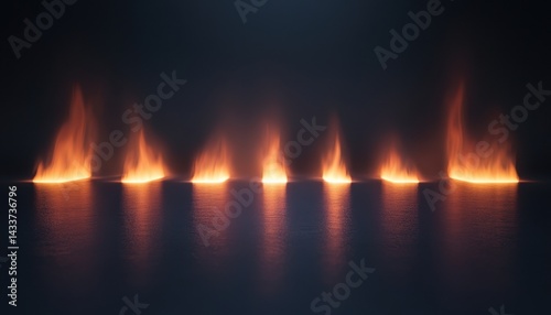 © Rahman, Naklejka premium Abstract fire display against dark background. Six flames rising from a reflective surface