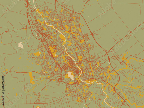 © W&S Stock, Obraz premium Abstract flat-design map of Hamilton, New Zealand, featuring olive backdrop with warm rust street network and ochre blocks.