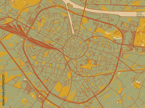 © W&S Stock, Obraz premium Abstract flat-design map of Hasselt, Belgium, featuring sage/olive tone field with rust networks and ochre shapes, cream water.