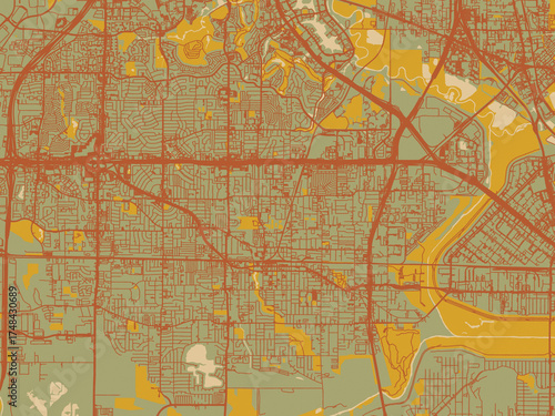 © W&S Stock, Obraz premium Abstract flat-design map of Irving, Texas, featuring olive backdrop with warm rust street network and ochre blocks.