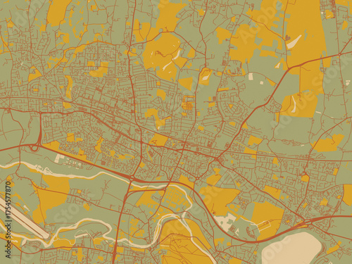 © W&S Stock, Fototapeta premium Abstract flat-design map of Slough, United Kingdom, featuring muted sage base, rust-colored roads, and soft ochre highlights.