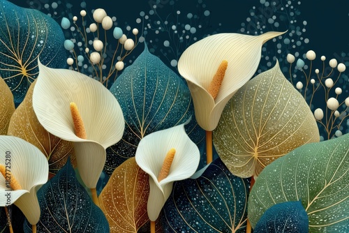 © Georgii, Naklejka premium Abstract floral illustration of white calla lilies with colorful leaves and delicate textures
