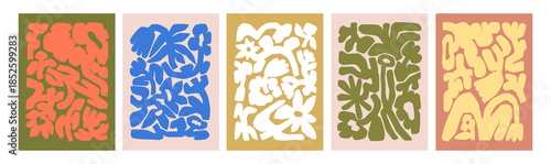 © Good Studio, Fototapeta premium Abstract floral patterns, modern style card designs set. Creative flower posters with trendy shapes pattern, textures, whimsical nature backgrounds, doodle drawings. Flat vector illustrations