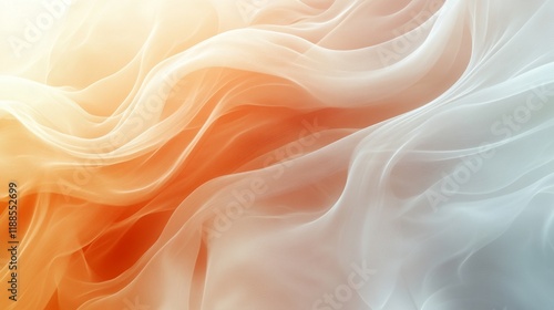 Obraz premium Abstract flow of translucent fabric with a gradient from light orange to white and light blue creating a soft ethereal texture