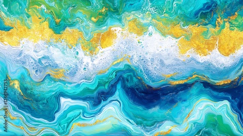 © heinng, Obraz premium Abstract Fluid Art Vibrant Teal Gold Swirls. AI Generated
