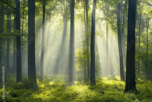 Fototapeta premium Abstract forest in soft shades of green, sunlight streaming through with room...