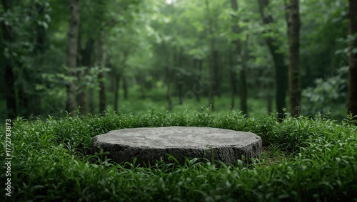 Fototapeta premium Abstract forest setting with a stone base and greenery, suitable for natural...