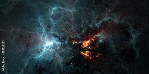 © synthetick, Fototapeta premium Abstract fractal art banner background suggestive of a supernova or fiery storm in a dark sky with lightning.