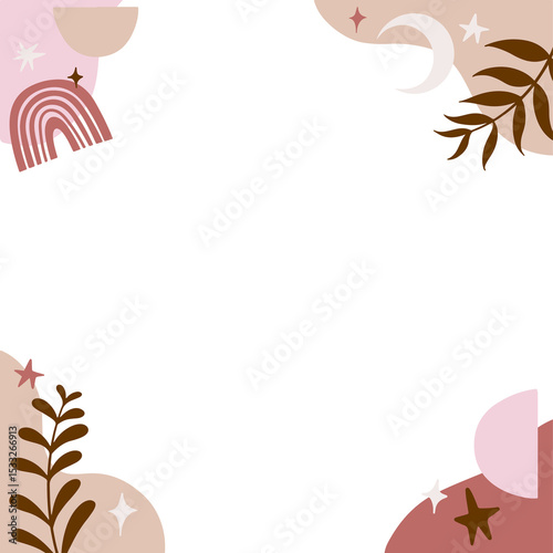 © vectorfusionart, Obraz premium Abstract frame showing pastel rainbow, moon, stars and leaves on transparent background, copy space