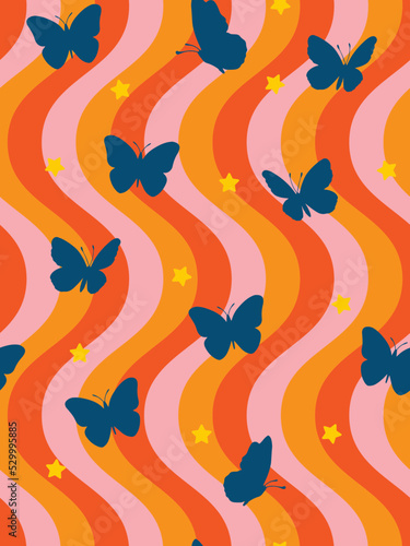 Fototapeta premium Abstract Funky Wavy Stripes Butterfly Silhouettes Stars Retro Minimalist Geometric Simple Pattern Trendy Fashion Colors Perfect for Allover Fabric Print or Wrapping Paper