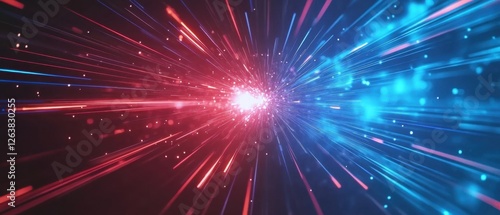 Naklejka premium Abstract futuristic background with fast speed light streaks and particles in red and blue Concept of science fiction, hyperspace jump, data transfer, and energy flow