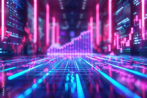 Fototapeta premium Abstract futuristic cityscape with neon lights and glowing lines representing data and growth.