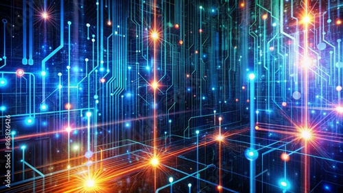 Naklejka premium Abstract futuristic digital background with binary code streams, glowing circuits, and neon lights, symbolizing secure data transfer and network connection.