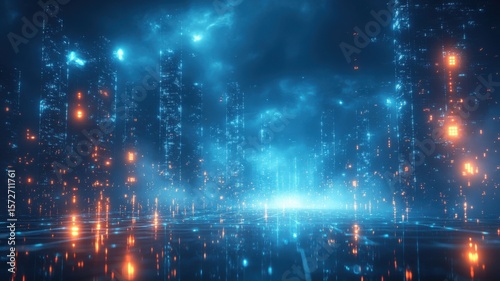 Obraz premium Abstract Futuristic Digital Cityscape with Glowing Blue and Orange Lights and...