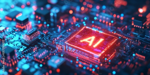 © Bold24, Fototapeta premium Abstract futuristic digital technology background with glowing hologram text "AI" and logo of an AI chip on a circuit board