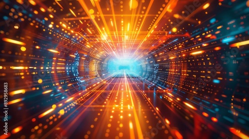 © Otseira, Fototapeta premium Abstract futuristic technology abstract background with lines for network, big data, data center, server, internet, speed. yellow and red neon lights into digital technology tunnel
