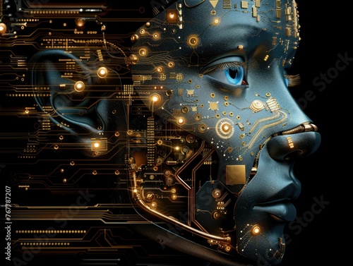 © Tida, Fototapeta premium Abstract futuristic technology background concept - Shiny glowing circuit board with futuristic technology elements in a black gold color scheme create a sleek abstract background image