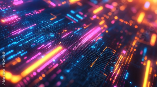 © samrit, Obraz premium Abstract futuristic technology background with glowing neon blue, orange, pink, and yellow lights creating a digital pattern