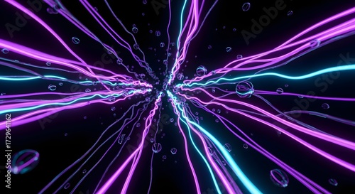© Fachri, Naklejka premium Abstract futuristic tunnel of glowing purple and cyan data streams with liquid bubbles on a dark background.