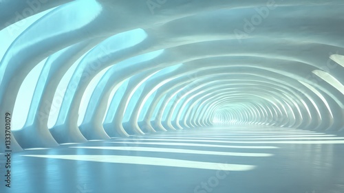 © Yopi, Naklejka premium Abstract Futuristic Tunnel: Pale Blue Lighting and White Curves