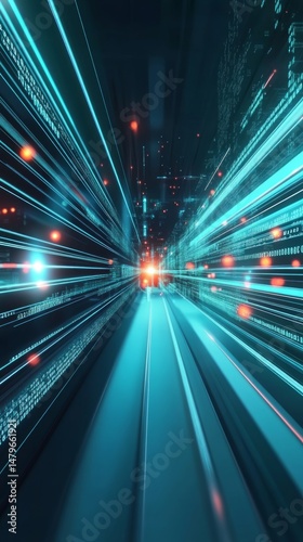 © Rayhans, Obraz premium Abstract Futuristic Tunnel with Glowing Blue Lines and Red Orbs Representing Digital Network and High Speed Data Transfer in a Modern Technological Illustration