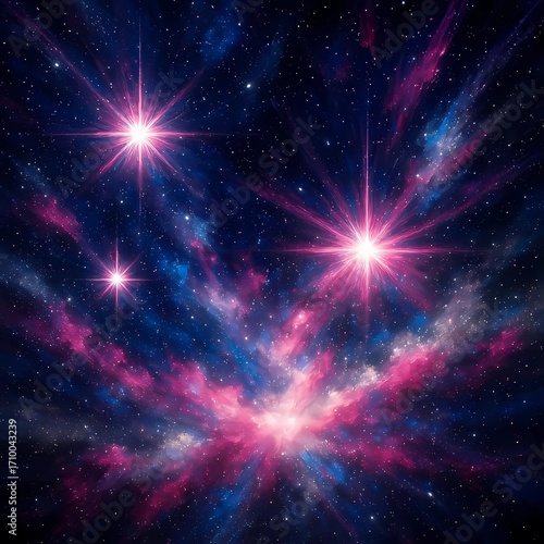 © Khalida, Fototapeta premium Abstract galaxy wallpaper with bright star bursts, cosmic dust clouds in pink, blue, and silver, dynamic movement and glowing effects