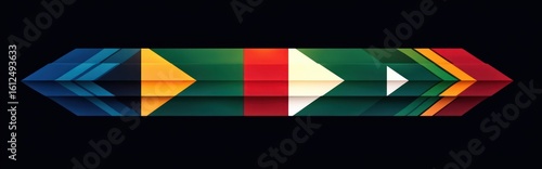 Fototapeta premium Abstract geometric arrow composed of layered multicolored shapes pointing right on a dark background conveying direction and movement