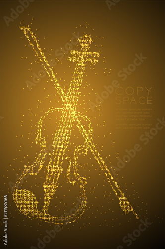 © paitoonpati, Obraz premium Abstract Geometric Bokeh circle dot pixel pattern Violin and bow shape, music concept design gold color illustration isolated on brown gradient background with copy space, vector eps 10