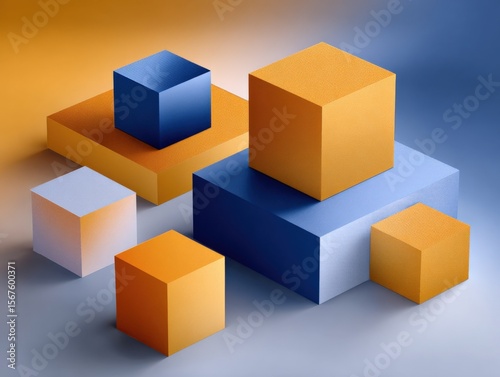 © The Little Hut, Fototapeta premium Abstract geometric composition with colorful cubes and squares on smooth surface with vibrant background in modern minimal art style