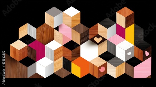 © ยลรดี ชะโนวรรณะ, Obraz premium Abstract Geometric Composition with Colorful Shapes and Wood Textures on Black Background