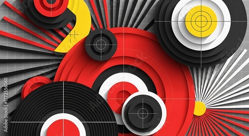 © aulia, Obraz premium Abstract Geometric Composition with Concentric Circles and Radial Lines in Red, Black, and Yellow.