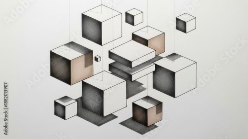 Obraz premium Abstract Geometric Cubes Hanging, Isometric Perspective, Monochrome with...