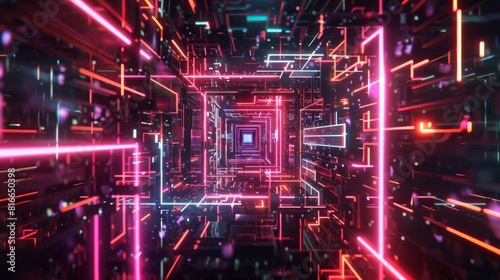 © Natalia8888, Obraz premium Abstract geometric, dinamic background with shapes and neon lines glowing in ultraviolet light. Generative AI
