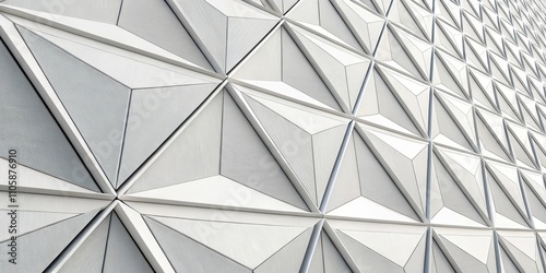 © Theerawat, Obraz premium Abstract Geometric Facade A Modern Architectural Design Featuring Interlocking Triangular Panels in Shades of White and Gray