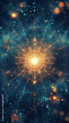 © NpicArt, Obraz premium Abstract geometric glowing starburst pattern on a dark background