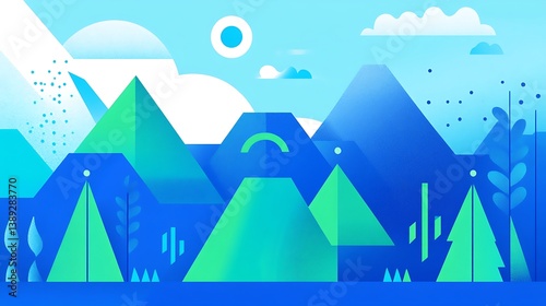 Naklejka premium Abstract geometric landscape with mountains, sky, and plants.