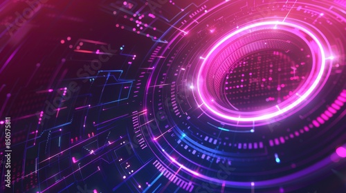 © Digital Dreamscapes, Obraz premium Abstract geometric neon circuit with glowing pink and purple lines and dots