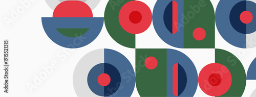 Obraz premium Abstract geometric pattern. Circles, semicircles, dots create colorful composition. Red, blue, green hues dominate design. Minimalist style.