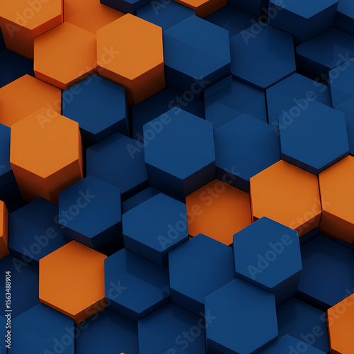© Flatart, Obraz premium Abstract geometric pattern of orange and navy blue hexagons. 3D graphic design with a modern aesthetic.