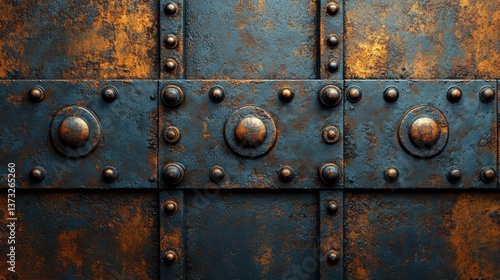 © Hvkk, Fototapeta premium abstract geometric pattern old worn copper antique rivets on cast iron metal wall surface with with bolts 3d render