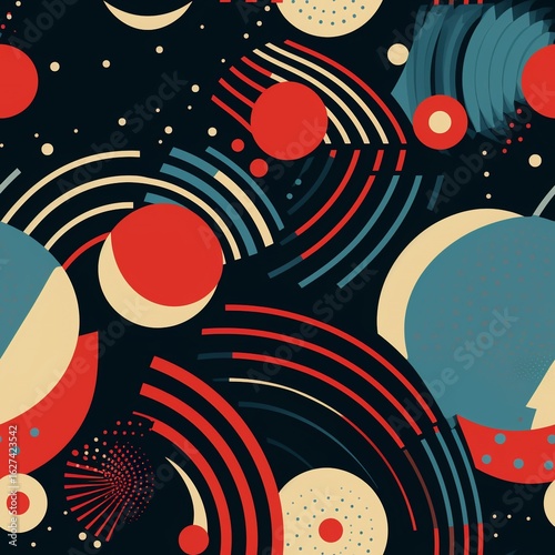 © patternworld, Obraz premium Abstract Geometric Pattern with Circles, Arcs, and Dots on Dark Background