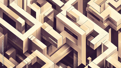 Fototapeta premium Abstract geometric pattern with 3D cubes and rectangles in beige and brown shades.