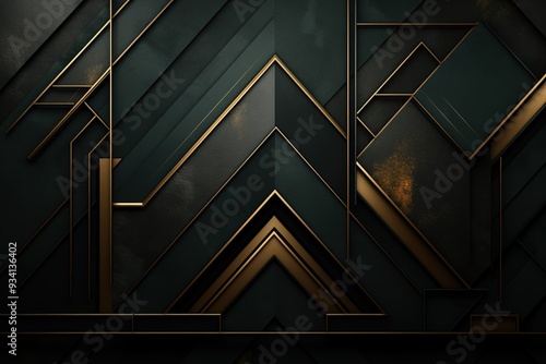 © tracerkamu, Fototapeta premium Abstract geometric pattern with gold accents on a black background.