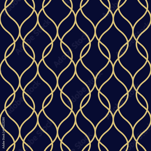© SHABBIR_AJMERI, Naklejka premium Abstract geometric pattern with wavy lines. A seamless vector background. Gold and blue-black ornament