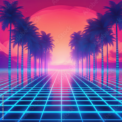 © Agata25, Fototapeta premium Abstract geometric pool party background with colorful neon lines. Generative AI